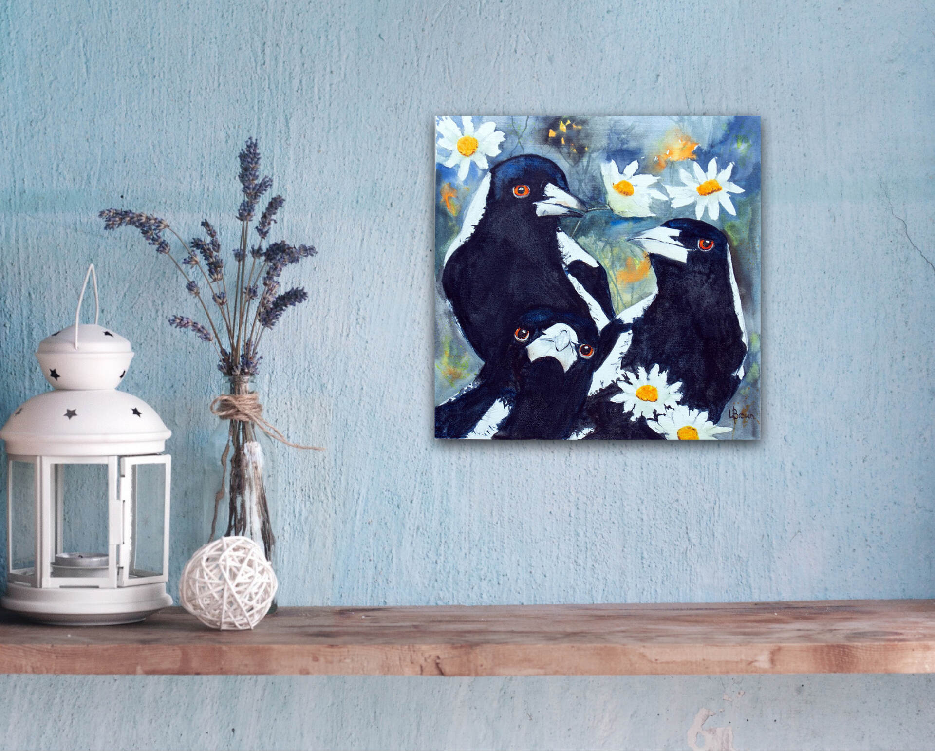 Maggies amongst the Daisies, painted in watercolour on a specially prepared wooden cradled panel and wax varnished allows it to be hung without additional framing or glass.