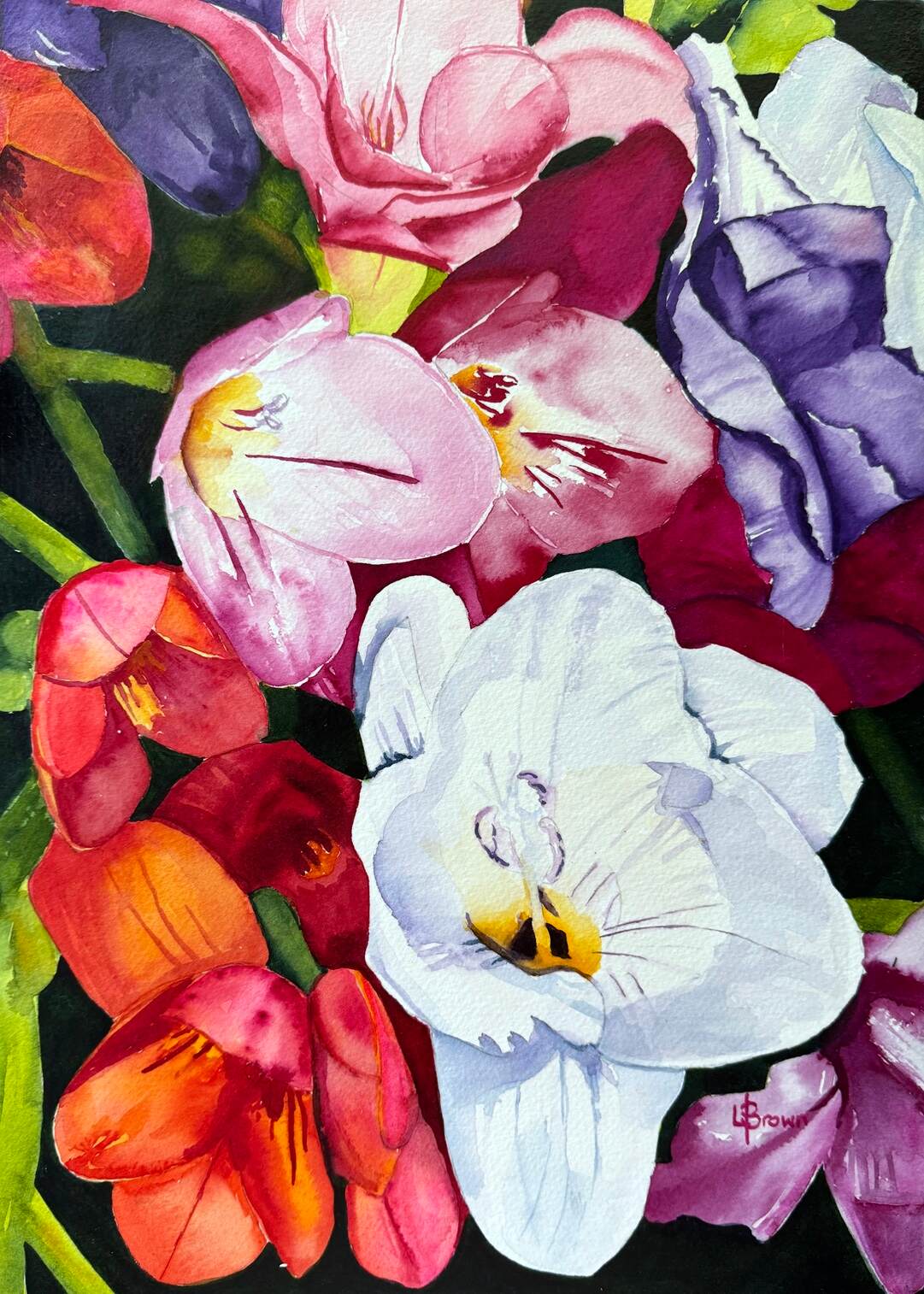 Freesia their fragrance and colour of Spring painted in many thin glazes of pigment to retain clarity and brilliance of hues.