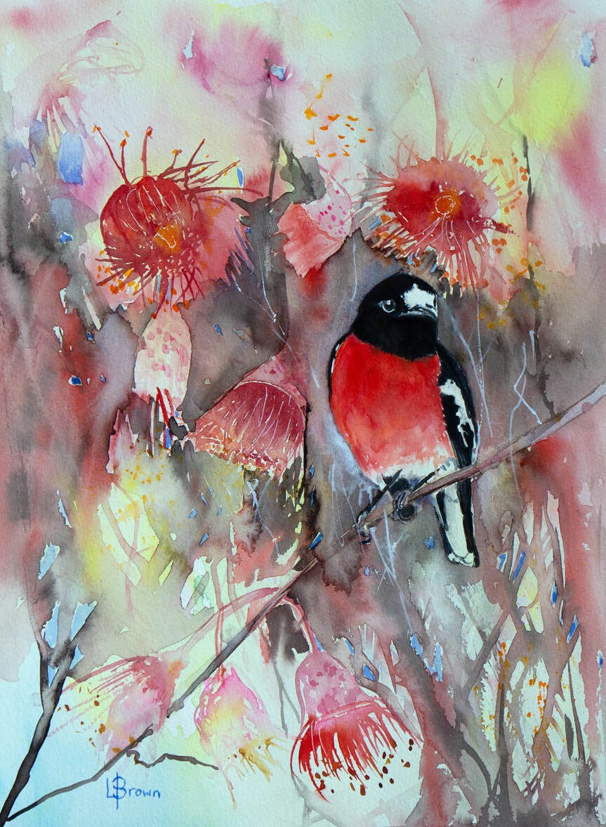 Created on a light wash of fused colours that has patiently waited to be chosen for a subject. Playing with colour washes are never a wasted exercise as they often lead to the perfect start for a painting suiting this perfectly for the Scarlet Robin and gum blossom.