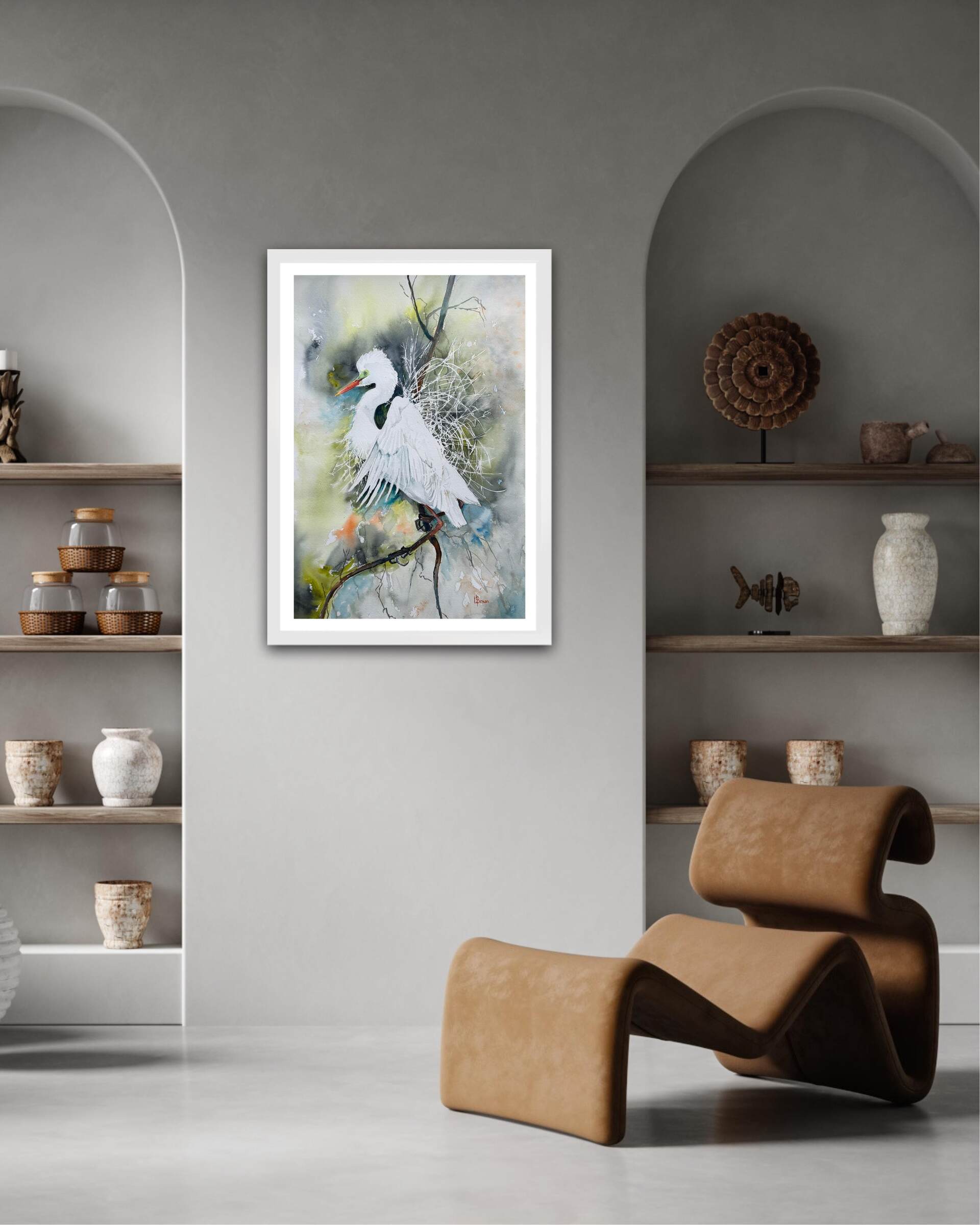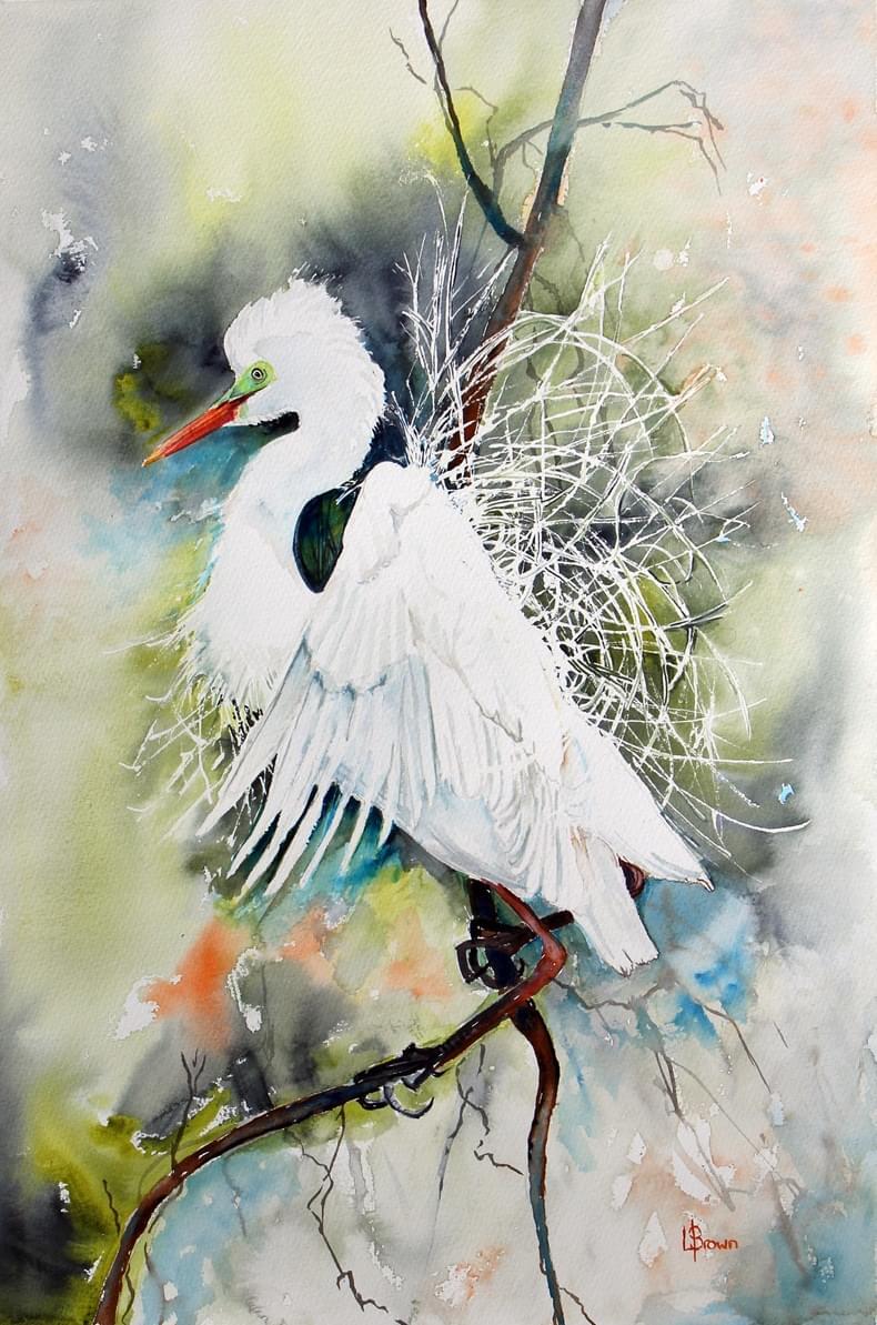 Colourful washes for foliage echo the small amount of colour depicting the graceful bird during the breeding season. Egrets undergo dramatic changes, they grow long, delicate nuptial plumes on their backs and the skin between the eye and bill turns a vivid lime-green. Legs may also become pinkish-yellow at the top.