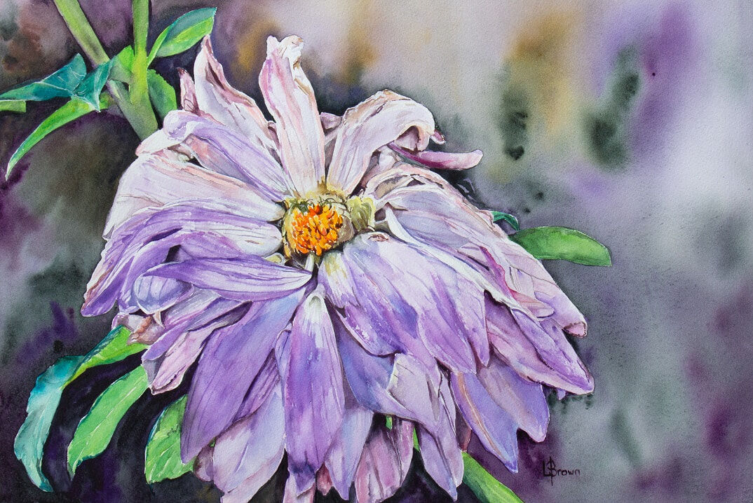 A muted and soft palette of colours has been used to capture the final days of a beautiful Dahlia.